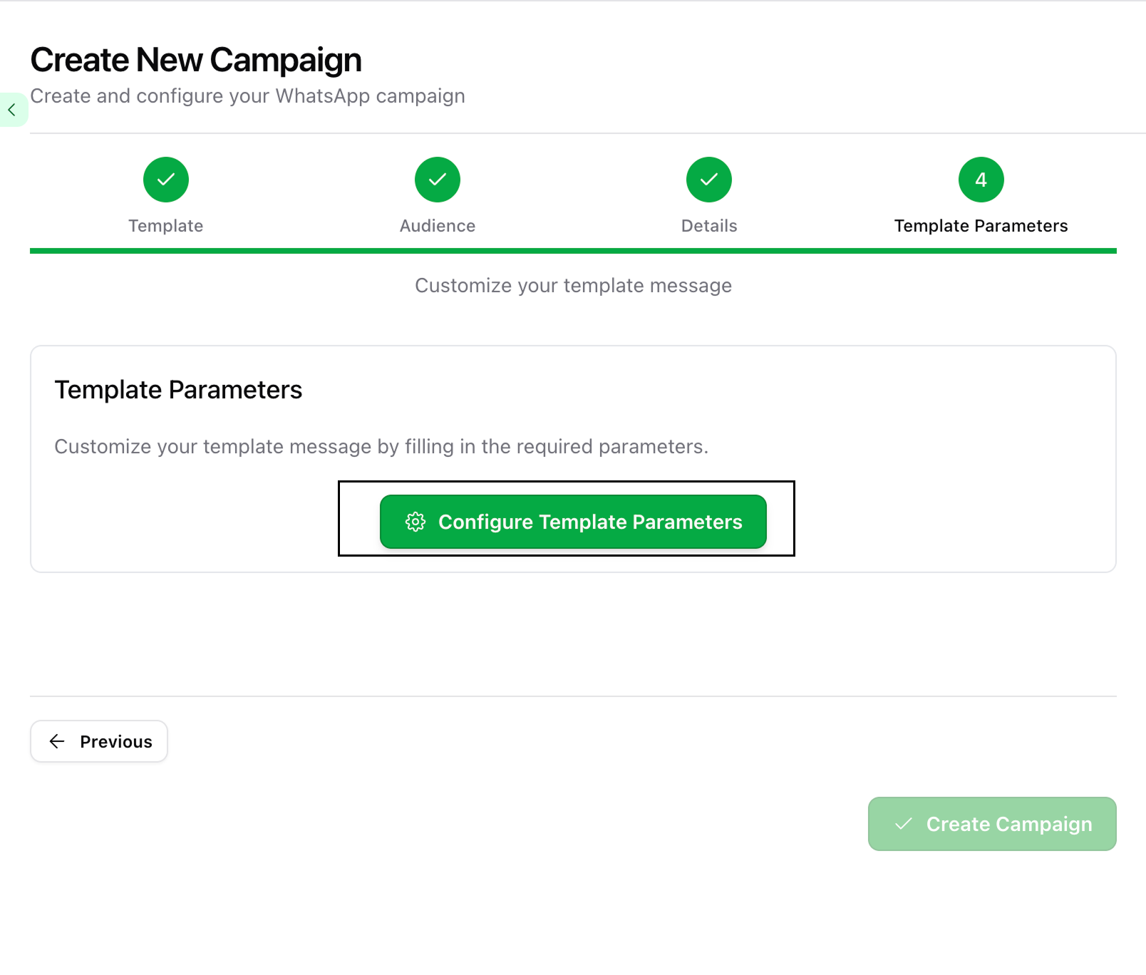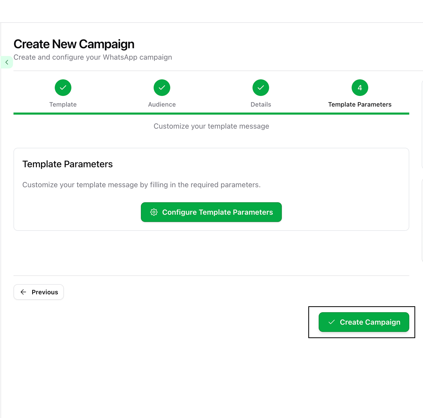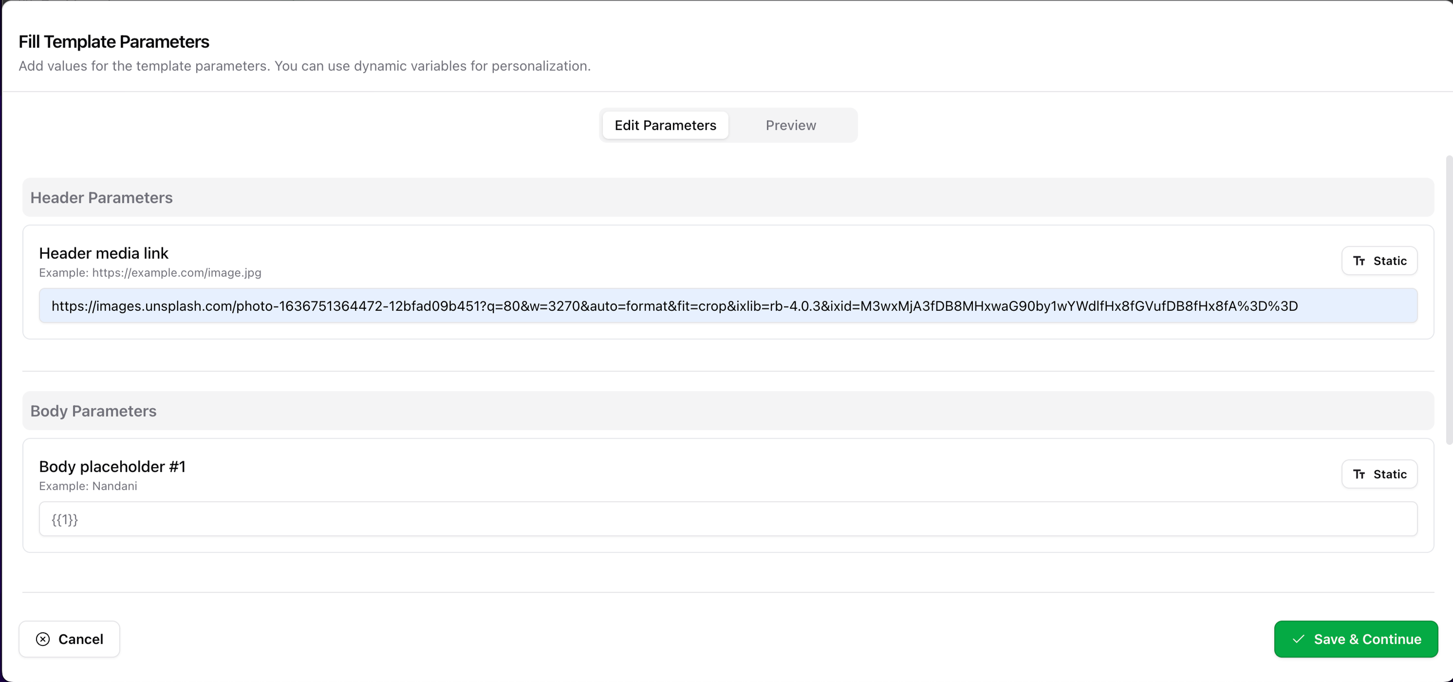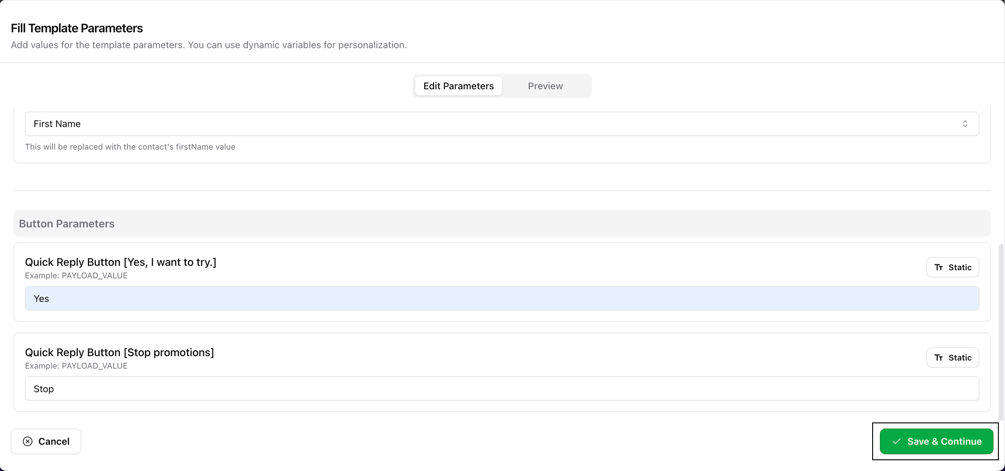 This step will appear only if your selected template includes parameters like personalization fields or quick replies.