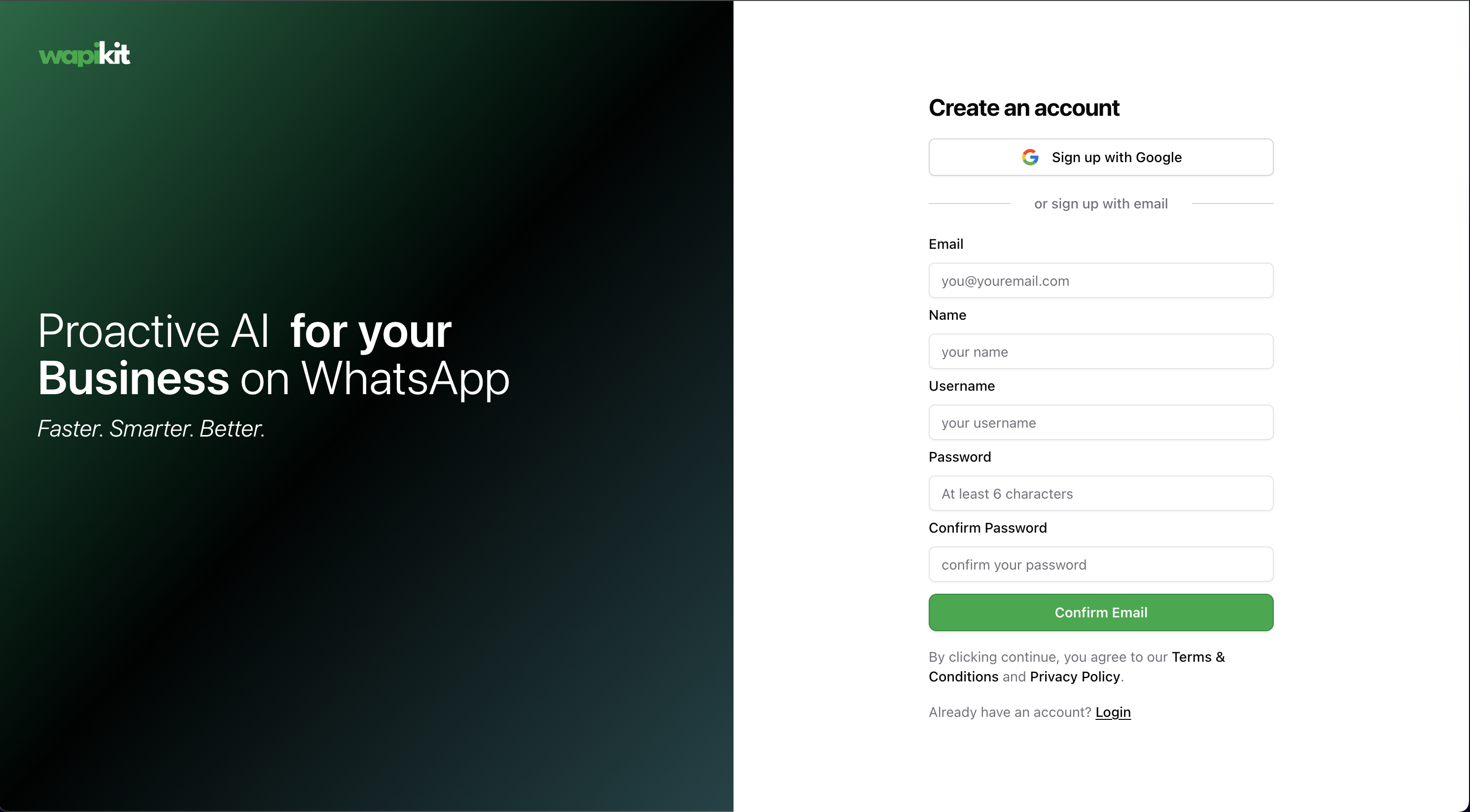 Once you sign up, follow the onboarding steps. Wapikit will collect your business website and data to personalize your setup automatically.